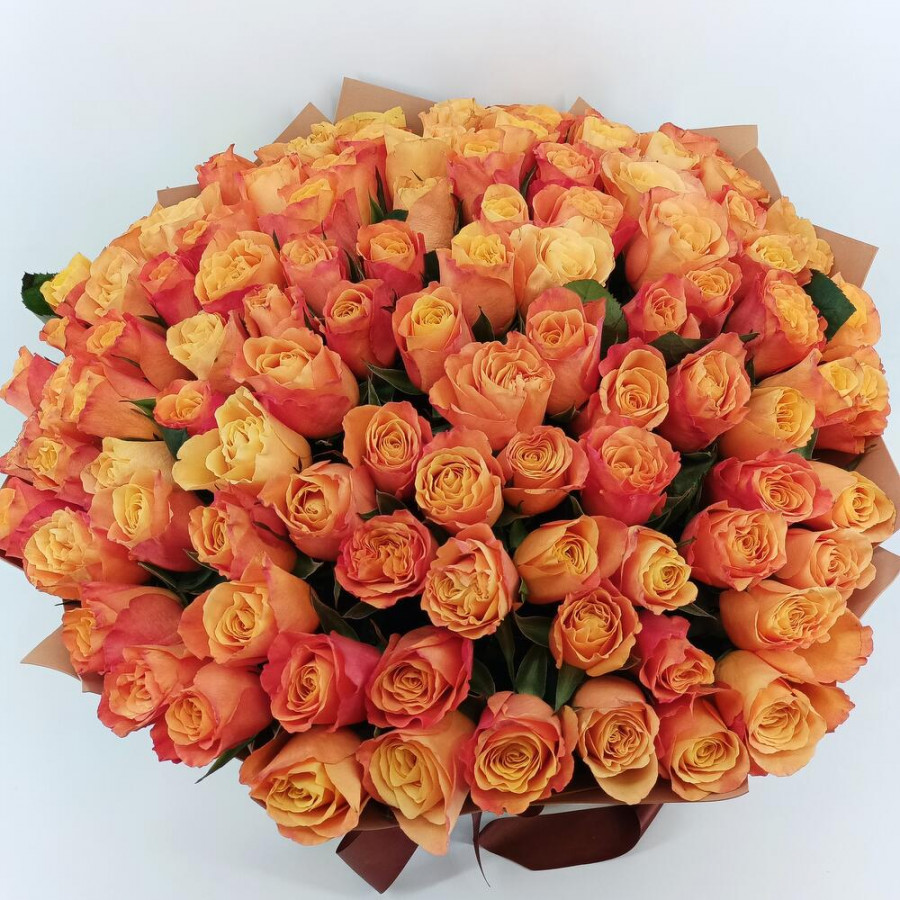 На фото букет из 101 оранжевой розы. В составе: роза 101 шт, крафт-бумага 2 шт, атласная лента 2 шт, . Все цветы свежие и ароматные, букет красиво оформлен и отлично подходит для подарка. Доступна доставка цветов или самовывоз.