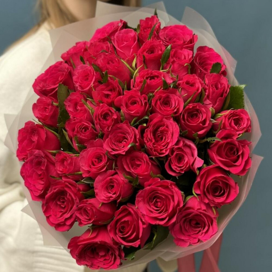 На фото букет из 41 малиновой розы. В составе: роза 41 шт, дизайнерская упаковка 2 шт, атласная лента 1 шт, . Все цветы свежие и ароматные, букет красиво оформлен и отлично подходит для подарка. Доступна доставка цветов или самовывоз.