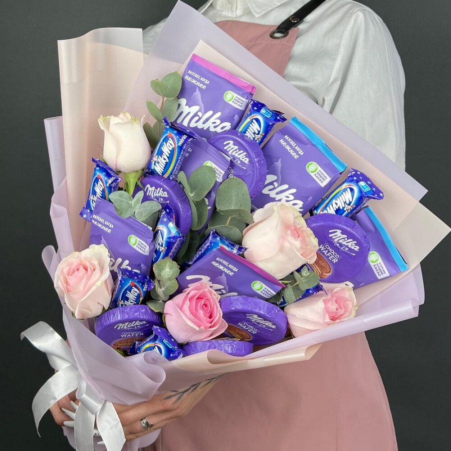 Букет из конфет Milka и розовые розы